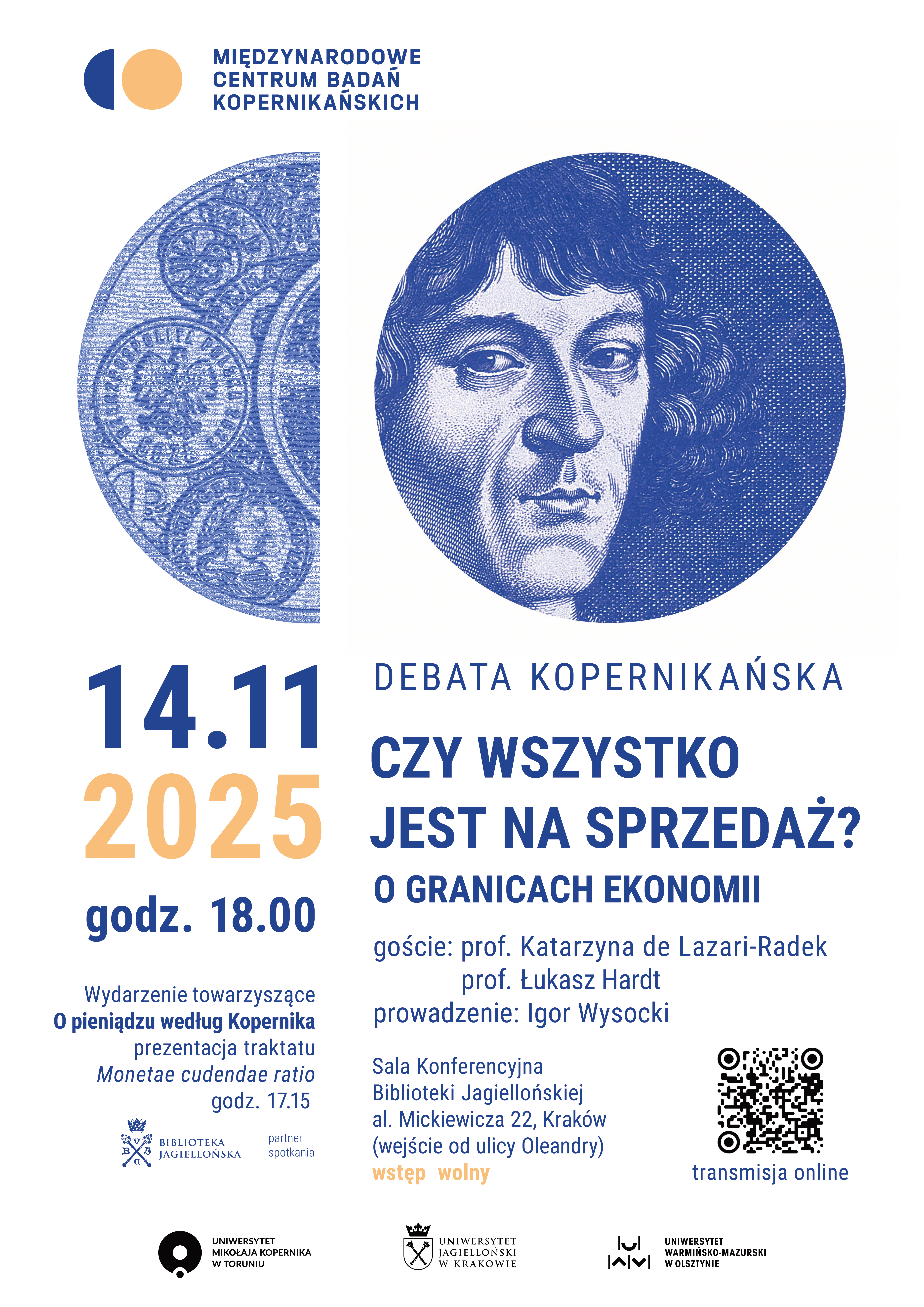 W tle tych rozważań towarzyszy nam postać Mikołaja Kopernika. Niewielu zdaje sobie sprawę, że obok astronomii podejmował on również zagadnienia dotyczące natury i wartości pieniądza w czasach, gdy pojęcie gospodarki dopiero się kształtowało. Debatę poprzedzi prezentacja traktatu Monetae cudendae ratio, którego pięćsetlecie obchodzić będziemy w przyszłym roku. Kopernik opisał tam procesy psucia monety i wypierania pieniądza lepszego przez gorszy – zjawiska znane dziś jako Prawo Kopernika–Greshama.