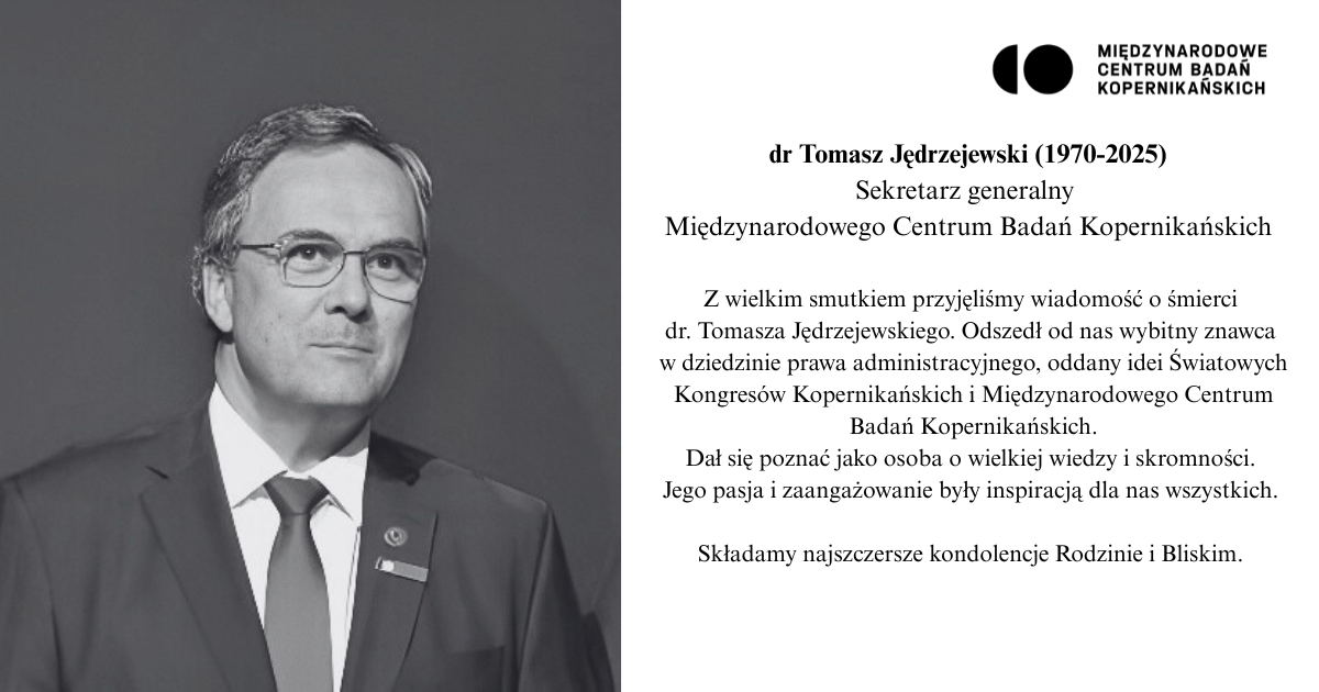 Z wielkim smutkiem przyjęliśmy wiadomość o śmierci dr. Tomasza Jędrzejewskiego. Odszedł od nas wybitny znawca w dziedzinie prawa administracyjnego, oddany idei Światowych Kongresów Kopernikańskich i Międzynarodowego Centrum Badań Kopernikańskich.